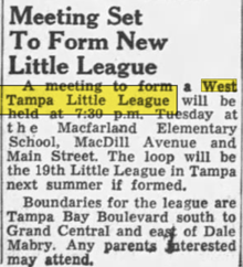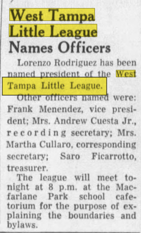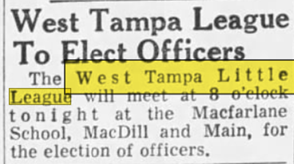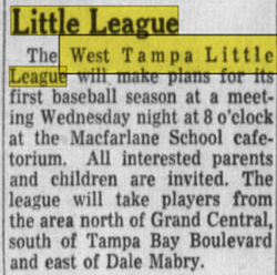 On Monday October 16th, 1961, a meeting was set to form The West Tampa Little League, District 6 at the time was much larger and fragmented in regard to boundaries, making WTLL it's 19th member. One week later on October 24th, 1961, the league met to elect officers. On November 5th, 1961, West Tampa Little League announced that they were opening registration with an informational meeting at Macfarlane Park Elementary school on November 8th by announcing boundaries that are still in effect as of today. Grand Central to the south (now known as Kennedy Blvd, South of Tampa Bay Blvd, and east of Dale Mabry. To cap it off, the league met one more time on Tuesday November 7th, 1961, to name positions within the league, making Lorenzo "Tapi" Rodriguez the first president in its history.